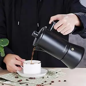 This premium stovetop coffee maker, also known as a classic moka pot, blends modern precision with Italian-inspired style.